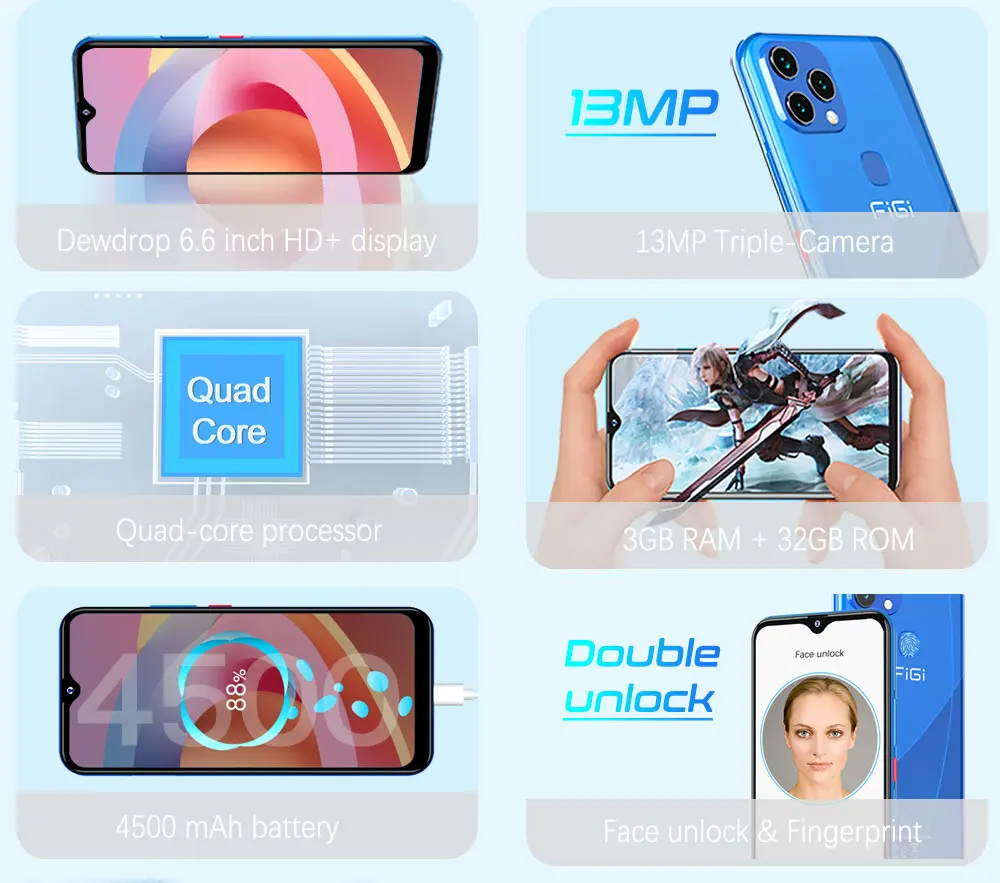 Figi Note 1c android 11 6.6 hd smartphone 32gb 3gb quad-core